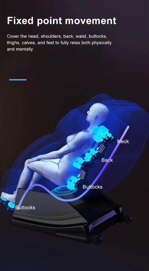 ١. تصميم ثابت ٢. تدليك الجسم بوسائد هوائية ٣. خاصية تدفئة الخصر والساقين ٤. بكرات تدليك القدمين ٥. صوت محيطي بتقنية بلوتوث ٦. شاشة لمس LED كبيرة ٧. خاصية انعدام الجاذبية ٨. ٥ برامج تلقائية ٩. تصميم مفتوح للقدمين